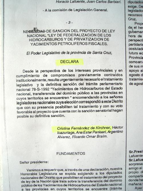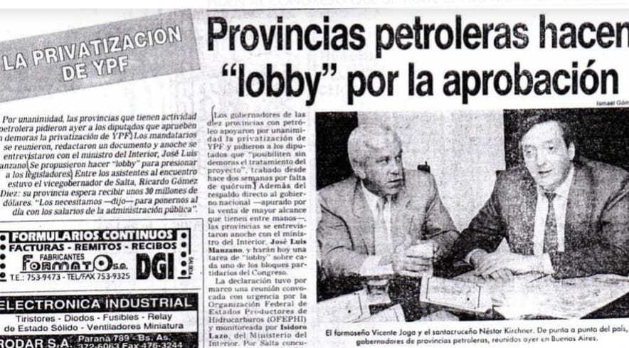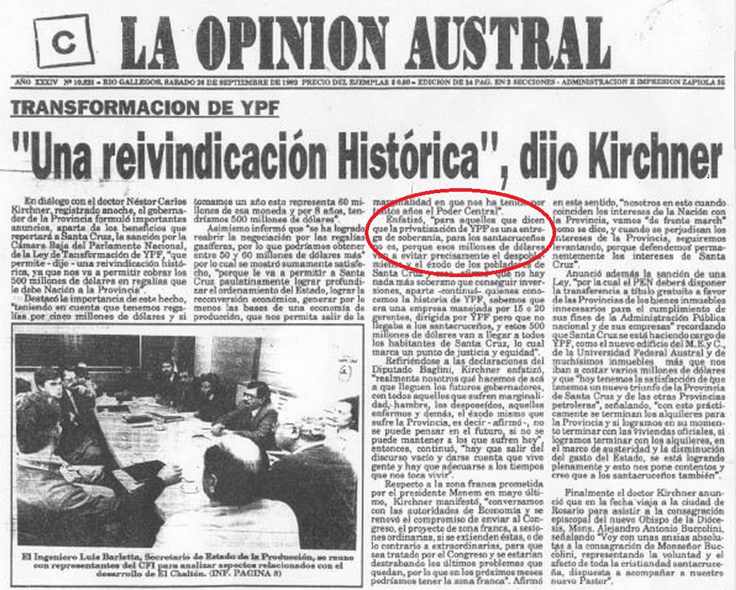 Cuando Néstor Kirchner era gobernador de Santa Cruz en el año 1993 hizo un trueque con el gobierno nacional de Carlos Menem: El Estado nacional le pagó U$S600 millones de dólares al gobierno de Kirchner en un acuerdo extrajudicial por regalías petroleras, a cambio de lo cual Kirchner le votaba en diputados a Duhalde la Ley del Fondo de Reparación del Conurbano Bonaerense. Ese trueque les permitió a Duhalde hacerse de una enorme masa de dinero para gobernar Buenos Aires, y a Néstor Kirchner una enorme masa de dinero, que Néstor se ocupó de que no figurara en la contabilidad oficial de la provincia.