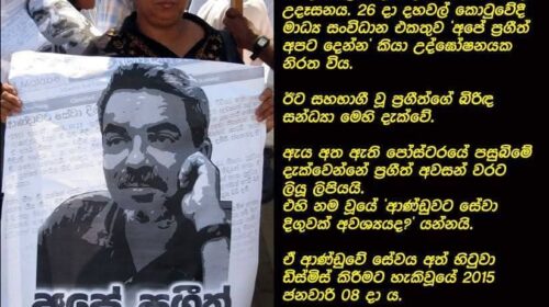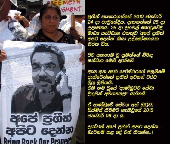 ප්‍රගීත්, මම එයාලට අවධාරණය කළේ ඔයාගේ දුර් වල සෞඛ්‍ය තත්ත්වය පිළිබඳව කිව්වා. ඔයාව ඉක්මනට හොයල දෙන්න කියලා. දැනන්  හිටියෙ නැහැ ඒ වෙනකොටත් සමනලයෙක් තරම් අහිංසක, පරඩලා පතක් වැනි ඔයාගේ ජීවය උන් උදුරාගෙන අහවරයි කියල.