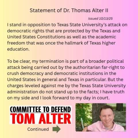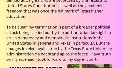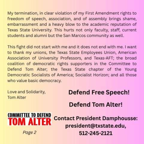Finally, attached are two important documents for building your campaign, both public documents. One is the Texas State University termination letter sent to Tom. The second is the legal response from his attorney. These documents make plain how Tom’s free speech rights, due process, and right to political dissent have all been egregiously violated.