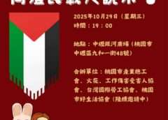 桃園悼念晚會 合辦單位:桃園市產業總工會、火花、台灣國際勞工協會、工傷協會、桃園市好生活協會(更多單位陸續邀請中) 殖民的戰火對台灣來說並非遙遠虛幻,而是切身相關。以色列自二次大戰後在巴勒斯坦土地的佔領和持續擴張,多年來受到國際社會關注,近日聯合國調查更認定在加薩走廊正發生「種族滅絕」。極端的情境導致恐怖主義發生,戰禍連綿,但問題根源實為美國撐腰的以色列殖民主義。近日停火協議恐又破局,我們呼籲更多市民與勞工朋友一起關心:國際強權主導的殖民計畫,往往導致基層人民流離失所、失去生命。本次晚會在桃園舉行,有悼念儀式、歌曲、議題介紹、公民論壇等,歡迎各位一同參加。 同時我們也向所有台灣關心巴勒斯坦的人民募集玩偶與玩具,在活動現場收集後我們會送至巴勒斯坦,讓巴勒斯坦的孩童感受台灣的溫暖。 時間:2025/10/29(三) 19:00 地點:桃園市中壢區銀河廣場