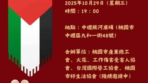 殖民的戰火對台灣來說並非遙遠虛幻,而是切身相關。以色列自二次大戰後在巴勒斯坦土地的佔領和持續擴張,多年來受到國際社會關注,近日聯合國調查更認定在加薩走廊正發生「種族滅絕」。極端的情境導致恐怖主義發生,戰禍連綿,但問題根源實為美國撐腰的以色列殖民主義。近日停火協議恐又破局,我們呼籲更多市民與勞工朋友一起關心:國際強權主導的殖民計畫,往往導致基層人民流離失所、失去生命。本次晚會在桃園舉行,有悼念儀式、歌曲、議題介紹、公民論壇等,歡迎各位一同參加。