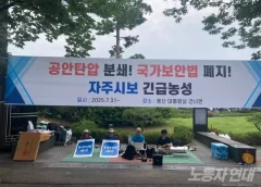 〈노동자 연대〉 553호 입력 2025-08-03 23:30김영익 7월 31일 〈자주시보〉 기자들이 공안탄압 분쇄, 국가보안법 폐지를 외치며 용산 대통령실 앞에 긴급 농성에 돌입했다. 그리고 폭염 속에서 농성을 이어 가고 있다. 〈자주시보〉는 지난해 보안법 위반 혐의로 김병길 대표와 전현직 기자 3명이 압수수색을 당했다. 그리고 지난 7월 1일 기자 3명이 경찰에 체포된 후 나중에 풀려난 데 이어, 추가로 다른 한 기자도 보안경찰로부터 출석 요구를 받았다. 8월 3일 농성장에서 만난 김영란 〈자주시보〉 편집국장은 최근 보안법 탄압 타깃이 비단 자신들만이 아니라고 말했다. “이재명 정부가 출범한 다음에 공안기관이 더 기승을 부리고 있어요. 저희는 출석 요구에 응하지 않았다고…